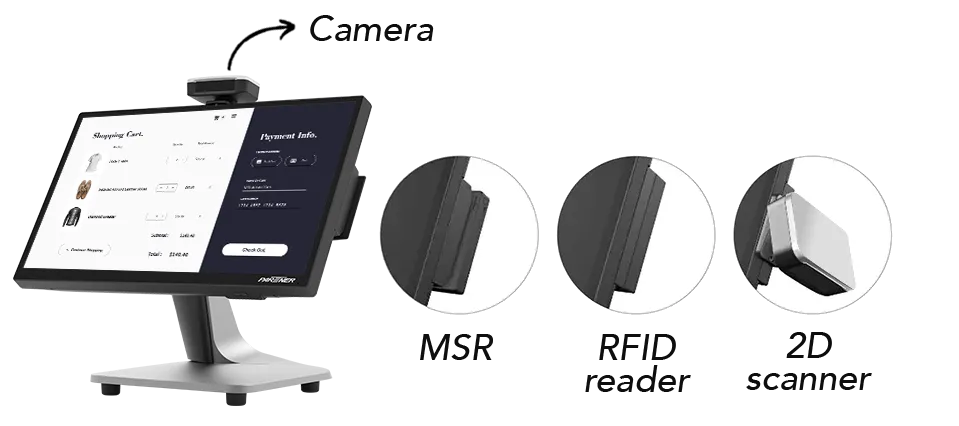 - 10.1″, 11.6″, 15″ guest facing display