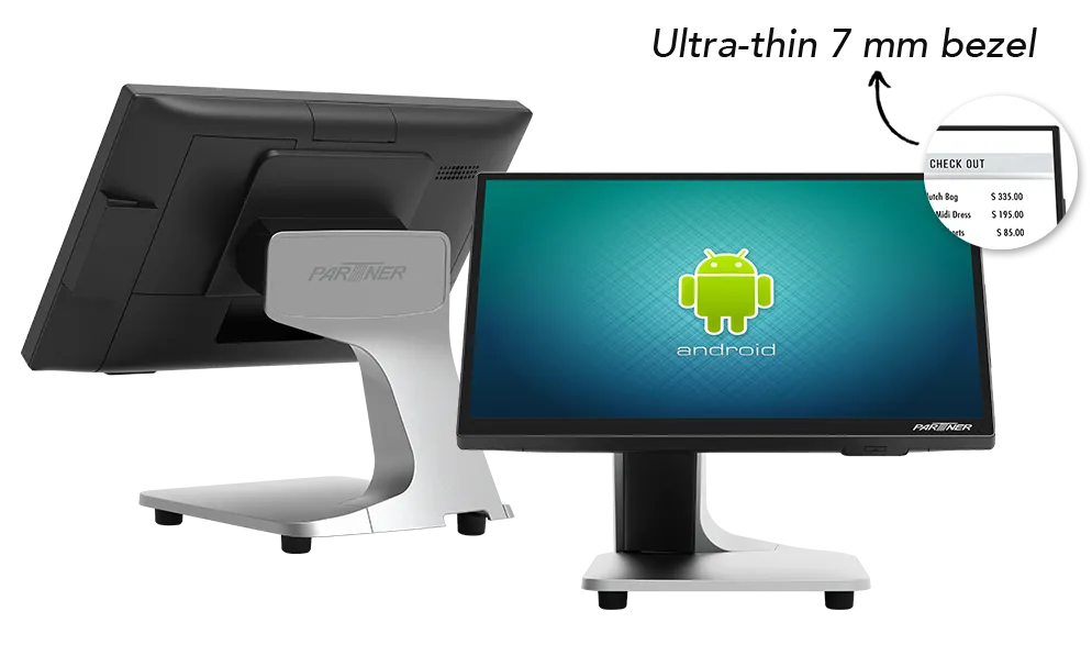 Based on Audrey's elegant design, but with a significantly slimmer bezel (only 7 mm), A5-2-R looks even more appealing than its predecessor and matches any type of modern store interior. All cables are neatly concealed inside the base to keep the counter clutter free.