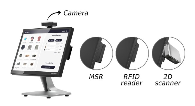 - Encryption-capable MSR, EMV reader, Bio reader, NFC, iButton, Camera, 2D BCR