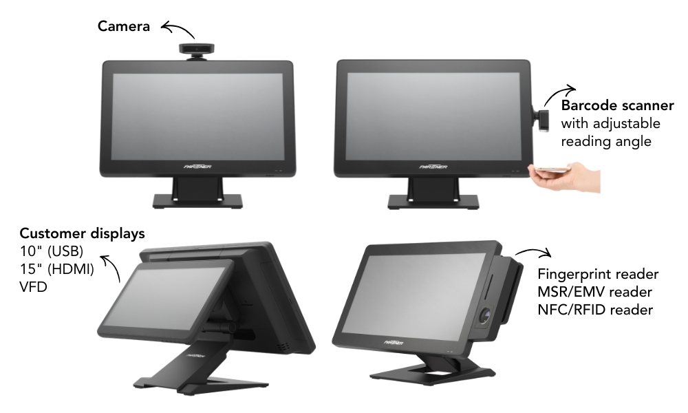 | Peripheral Options | MSR, EMV reader, RFID/NFC reader, fingerprint reader, 2D barcode scanner, camera, cash drawer VFD, 10.1" 2nd display (USB), 15.6" 2nd display (HDMI) |